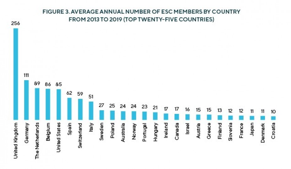 Figure 3. Average annual number of ESC members by country from 2013 to 2019 (top twenty-five countries)