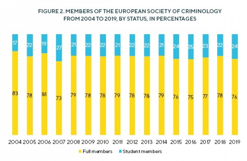 Figure 2. Members of the European Society of Criminology from 2004 to 2019, by status, in percentages